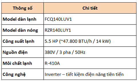 Công suất 5.5HP (47.800 BTU/h), phù hợp không gian lớn như phòng họp, sảnh, nhà hàng.